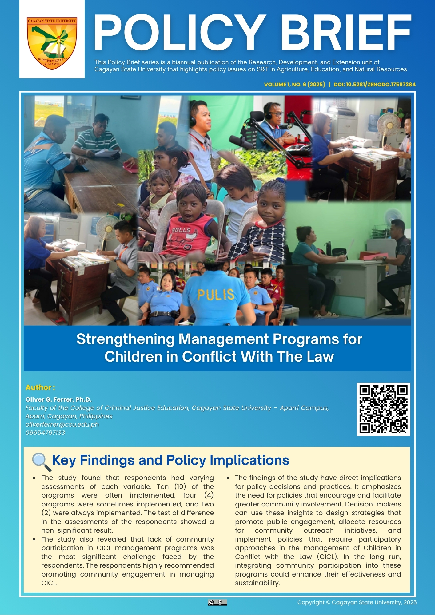 Individuals who are below a certain age, as defined by the legal system of a particular jurisdiction, and who have committed actions that are considered offenses or crimes under the law, are known as children in conflict with the law. It is essential to recognize that children in conflict with the law are a vulnerable and distinct group within the criminal justice system. Their age, cognitive development, and life experiences can significantly influence their understanding of the consequences of their actions and their ability to make informed decisions. The legal treatment and handling of children in conflict with the law must consider their unique circumstances, focusing on rehabilitation, reintegration, and addressing the underlying factors that may have contributed to their involvement in criminal activities. In Aparri, Cagayan, Philippines, minors who have engaged in criminal activities or violated laws fall under the category of "children in conflict with the law." While this issue is not unique to Aparri, it is a concern in many communities worldwide. Efforts to address this issue in Aparri, Cagayan may involve a combination of legal, social, and educational interventions. This has sparked the interest of the researcher to investigate children in conflict with the law management programs in the area.