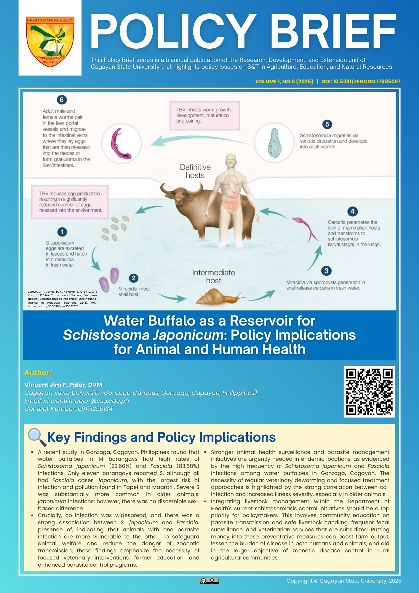 In the Philippines, schistosomiasis is still a major agricultural and public health issue, especially in rural areas where livestock are essential to farming. Humans and animals can contract the parasite trematode Schistosoma japonicum by coming into touch with water sources that are home to infected snails. Carabaos, also known as water buffaloes, are frequently employed in rice cultivation and are important reservoir hosts that support the parasite's ongoing spread. Because of the possible effects on both animal productivity and public health, local stakeholders in Gonzaga, Cagayan, are concerned about reports of probable illnesses in carabaos. Water buffaloes are especially susceptible to parasite illnesses, such as S, because to their wallowing nature and ongoing contact with rice paddies and irrigation canals. Fasciola and japonicum. Designing efficient control strategies for water buffaloes requires an understanding of the prevalence and risk factors of these illnesses. The purpose of this study was to determine the degree of Schistosoma japonicum infection in water buffaloes in a few Gonzaga barangays and to look for potential correlations with age, sex, and co-infection with Fasciola. In order to lower infection risks, protect animal welfare, and slow the spread of zoonotic illnesses in the area, the findings are meant to serve as a guide for local farmers, veterinarians, and legislators as they adopt focused interventions.