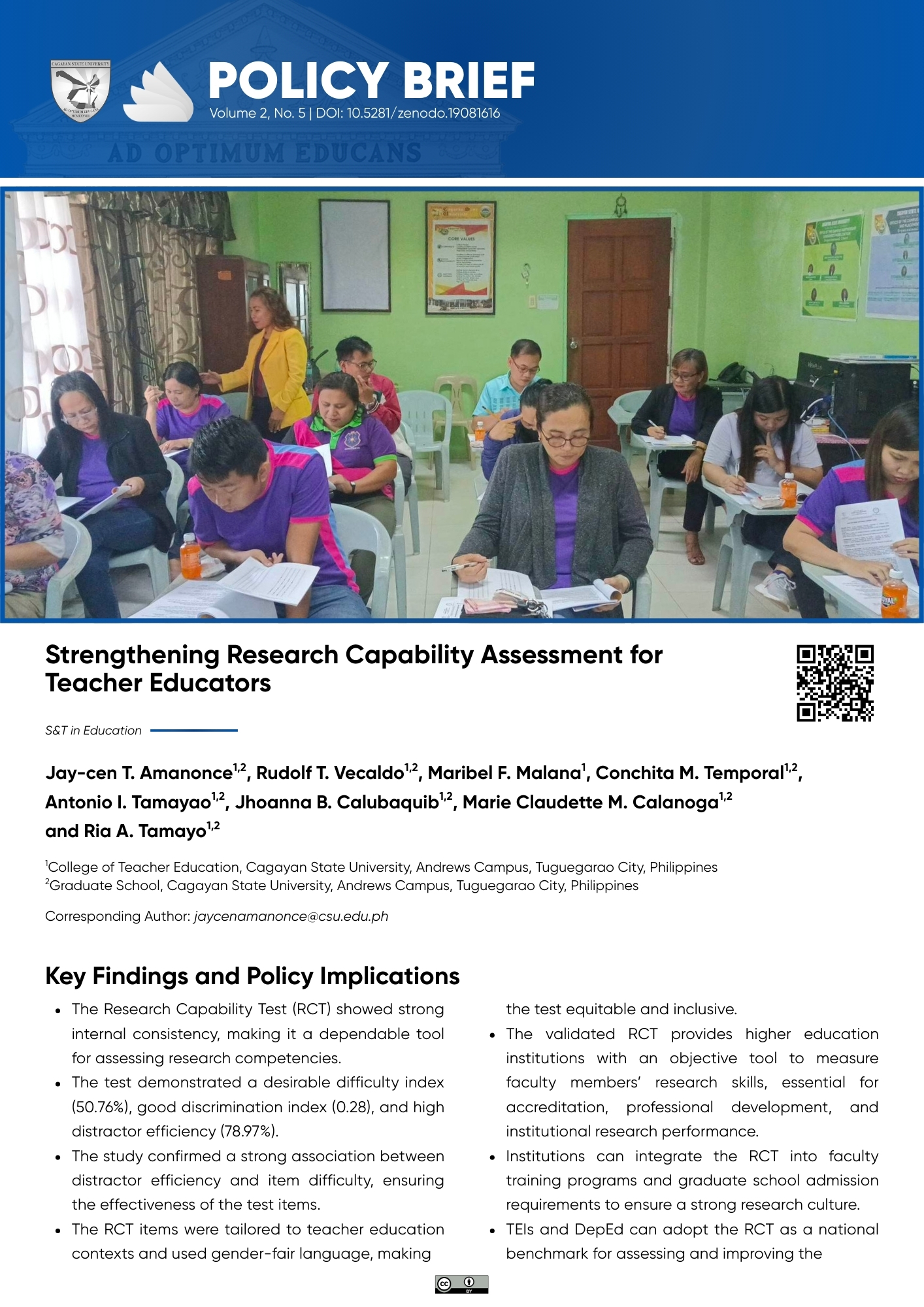 Research capability is essential in higher education institutions, particularly for faculty members who contribute to evidence-based teaching, policy development, and institutional growth. However, a significant gap exists in assessing the research capabilities of educators. The Commission on Higher Education (CHED) has identified research development as a priority, highlighting the need for reliable assessment tools. The Research Capability Test (RCT) was developed to address this gap, ensuring an objective measure of educators' competencies in conceptualizing, conducting, and publishing research.