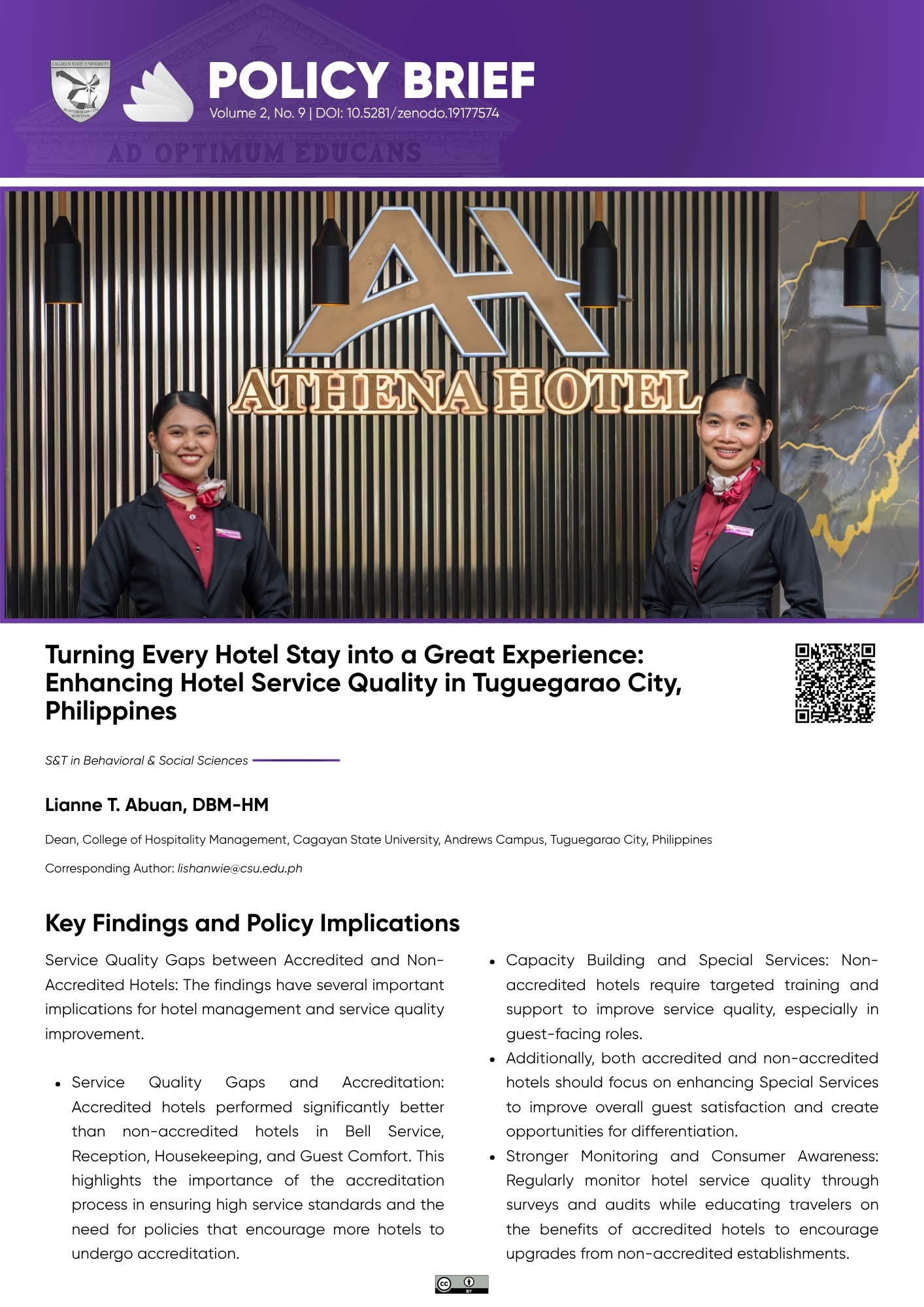 The findings also provide valuable guidance for local government units (LGUs), the Department of Tourism (DOT), and other industry stakeholders. They can be used to design targeted training programs, enhance accreditation standards, and establish stronger quality assurance frameworks. These initiatives will not only raise the standards of hotel operations but also boost Tuguegarao City’s competitiveness and appeal as a travel destination, supporting the sustainable growth of the tourism sector.